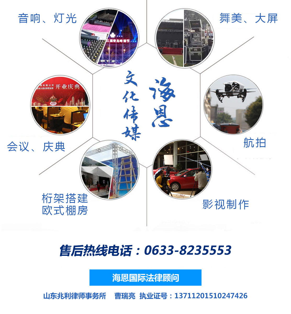 日照海恩國際展覽股份有限公司主要經(jīng)營:為文化藝術(shù)交流提供服務(wù),攝影攝像服務(wù),廣告圖文設(shè)計,舞臺設(shè)計,文化藝術(shù)交流策劃,舞臺藝術(shù)造型策劃,企業(yè)營銷策劃,商務(wù)信息咨詢,會議服務(wù),展覽展示服務(wù),禮儀慶典服務(wù),廣告設(shè)計制作等產(chǎn)品。公司尊崇“踏實(shí)、拼搏、責(zé)任”的企業(yè)精神,并以誠信、共贏、經(jīng)營理念,創(chuàng)造良好的企業(yè)環(huán)境,以全新的管理模式,完善的技術(shù),周到的服務(wù),我們始終堅...
